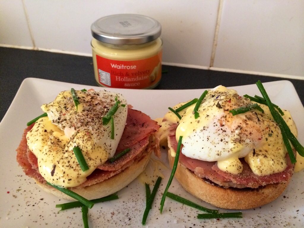 Assembled and plops of hollandaise sauce , store bought and very good plopped atop.. garden chives to complete.. With Bristol blend pepper and Mediterranean flower salt..