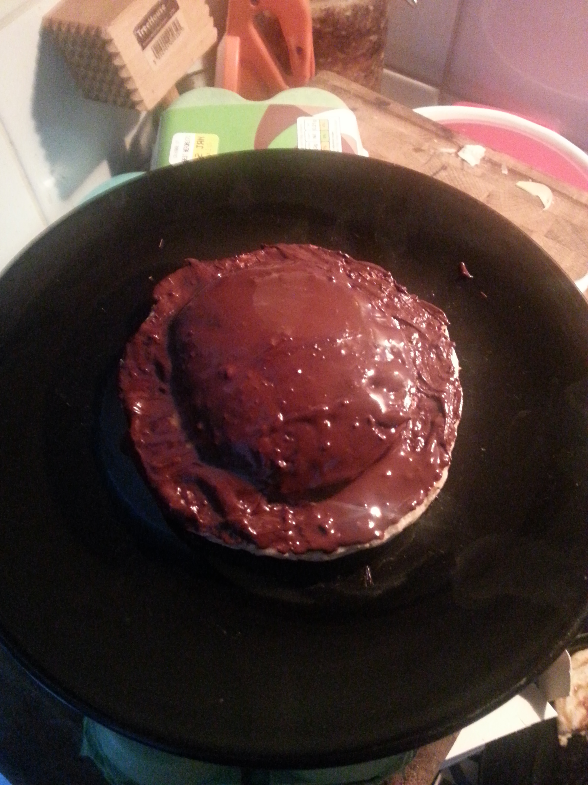 Once this is done, use a spoon or knife to spread melted dark chocolate all over the pancake, so that it looks like this: